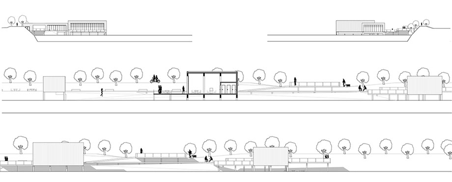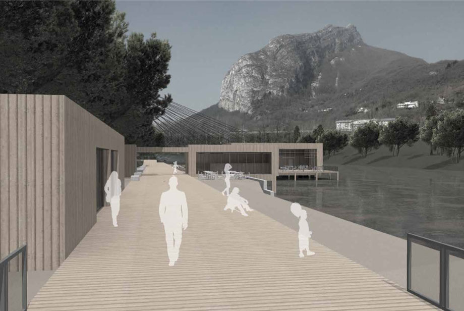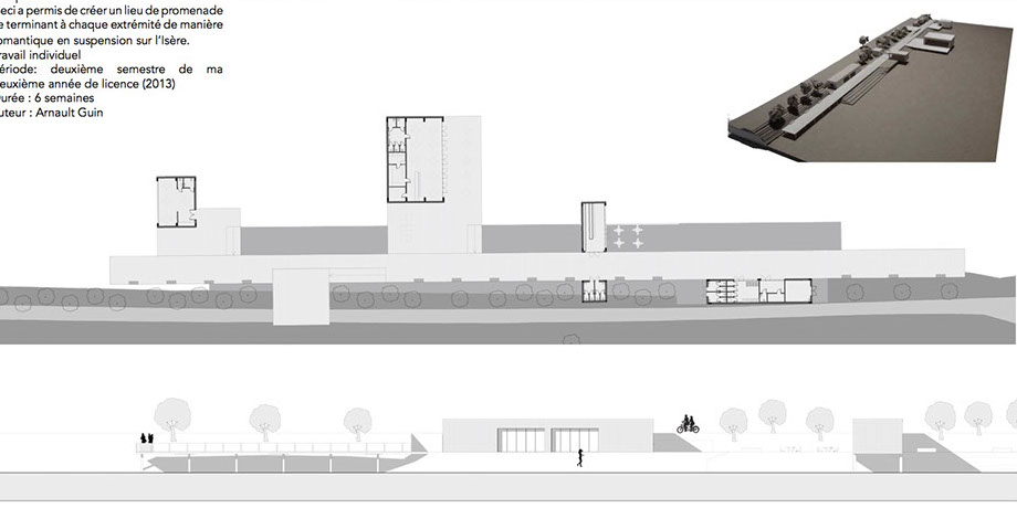 Le plan-masse du projet s’étale sur une partie de la berge. Ceci fut permis par un long plateau de promenade désservant différents plateaux bâtiments. De plus, cette disposition permet de disposer les différentes fonctions sur la berge en fonction de leur usage et de leur public. Ceci a permis de créer un lieu de promenade se terminant à chaque extrémité de manière romantique en suspension sur l’Isère.
