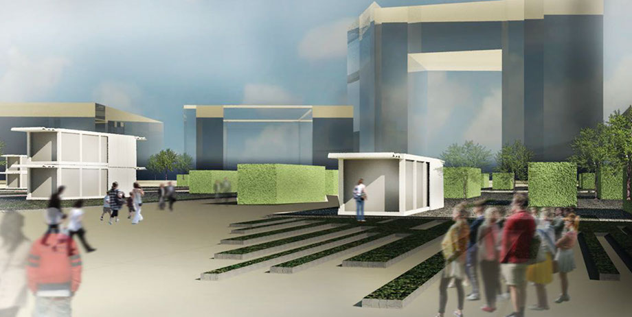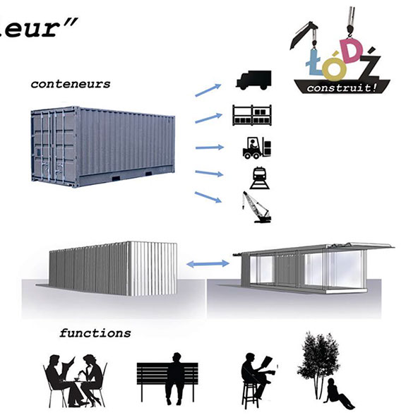 Le projet est basé sur des conteneurs maritimes ayant déjà été utilisés qui sont amenés jusqu’au site par voie ferroviaire. Ils sont alors réaménagés sur place ce qui permet de faire travailler l’économie locale. Chaque conteneur a une fonction particulière : jardins, bancs, tables, bars, restaurants, scène de concert et cinéma de plein air animant le centre-ville. Les conteneurs peuvent être déplacés sur le site au fur et à mesure que les constructions se propagent sur le site, grignotant l’espace public, grâce à une grue amovible disposée sur des rails et qui pourra aussi servir à la construction des futurs bâtiments !