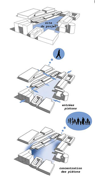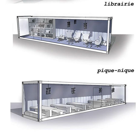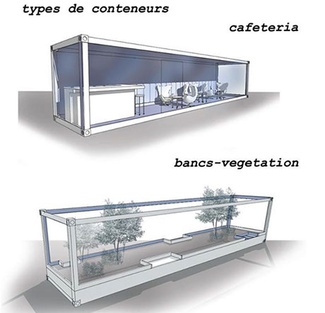 The project is based on decommissioned sea containers that are brought by rail to the site. They are then reconfigured on site thanks to local enterprises. Each container has a special function: gardens, benches, tables, bars, restaurants, concert stage and outdoor cinema animating this park at the city center. Containers can be moved on the site as and when new buildings are built on the site, nibbling the public space, with a removable crane positioned on rails that can also be used for the construction of the future buildings!