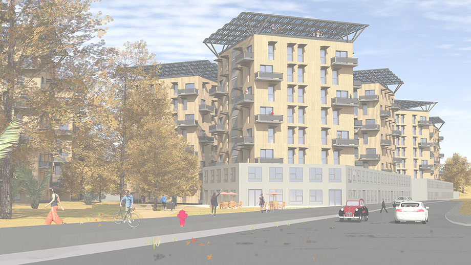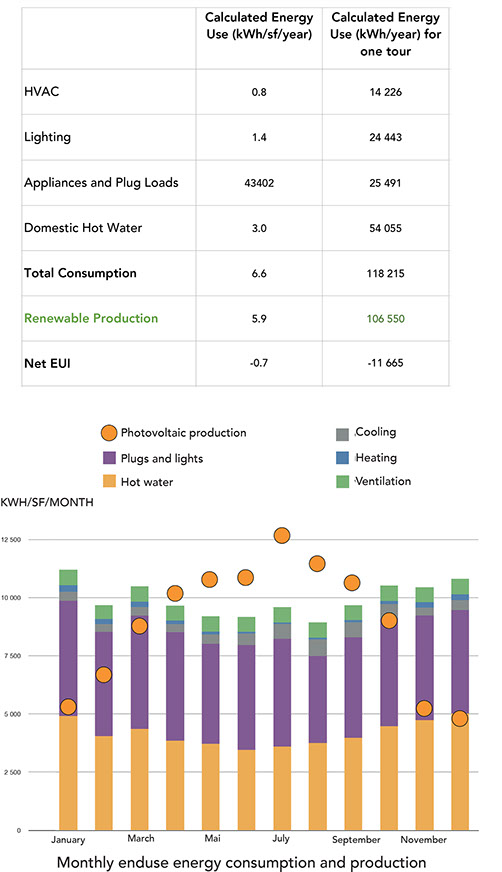 Ce projet vise à produire plus d’énergie qu’il n’en consomme. Les bâtiments produiront principalement de l’électricité grâce à leur canopée photovoltaïque. L’électricité supplémentaire produite chaque jour, principalement lors les heures de pointe (aux environs de midi), mais avec de faibles besoins en électricité sera utilisée pour charger des batteries des voitures électriques en autopartage.