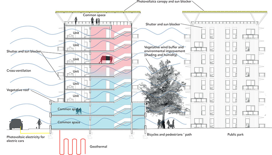 This project aims to achieve more than zero net energy consumption, it aims to produce more energy than it consumes. The buildings will mainly produce electricity through their photovoltaic canopy. The extra electricity produce each day, mainly on peak hours (near noon) but with low electricity demands will be used to charge electric car batteries to provide green transportation to the university.