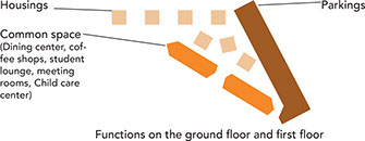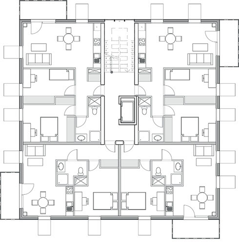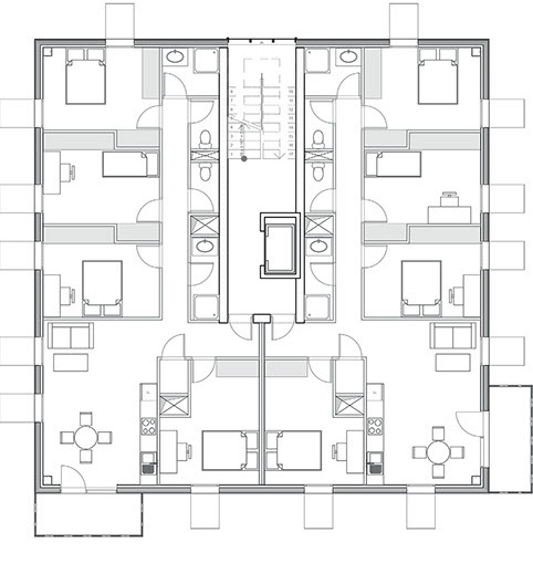 The buildings are based on a concrete structure (as Le Corbusier’s domino house). This structure will provide a good inertia to the housings. The facade walls will be made of prefabricated wall elements with a high insolation coefficient based on the Panobloc technology from Techniwood®.