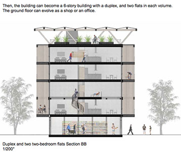 Ensuite, le bâtiment pourra devenir un immeuble de six étages avec un duplex et deux appartements de deux chambres. Le rez-de-chaussée évoluera également en magasin ou bureau.