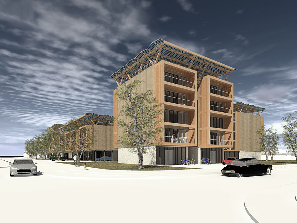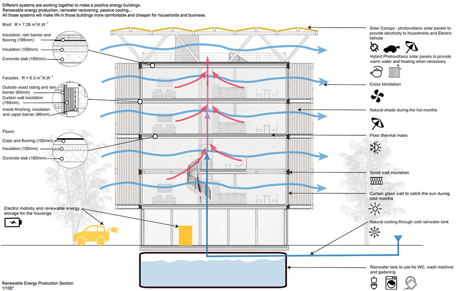 The project is based on positive energy buildings thanks to a good passive strategy (low energy requirements, solar shading, rainwater recovery, ventilation, passive cooling ...) and the production of renewable energy thanks to a solar roof to produce electricity and hot water.