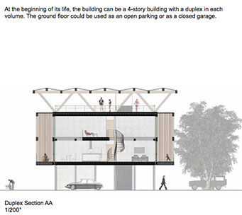 En effet, au début de leur vie, certains bâtiments auront quatre étages avec un duplex dans chaque volume. Le rez-de-chaussée sera utilisé comme stationnement ouvert ou comme garage fermé.