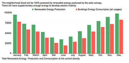 Les bâtiments ont été conçus pour produire plus d'énergie (électricité) qu'ils ne consomment afin de fournir de l'énergie électrique aux habitants du quartier.