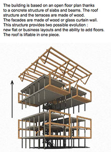 Cette adaptabilité est rendue possible grâce à une structure béton composée de dalles et de poutres et un toit en bois soulevable! Ainsi, les façades sont indépendantes et sont faites de mur en bois ou en verre.