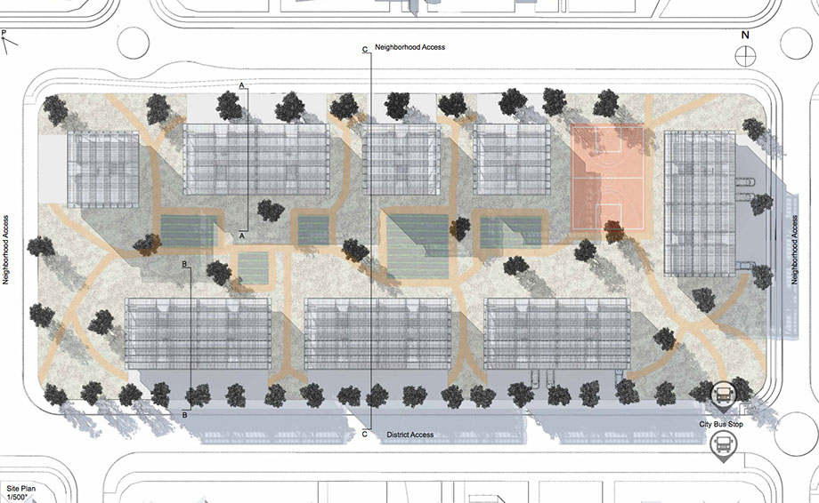 Chaque appartement a deux grandes terrasses. Le toit des bâtiments peut aussi être utilisé. Le centre de l’îlot est ouvert au public afin de se rencontrer, cultiver des légumes et faire du sport. Grâce à la grande évolutivité des bâtiments, différentes personnes (familles, célibataires, personnes âgés, étudiants) pourront habiter dans ce projet.